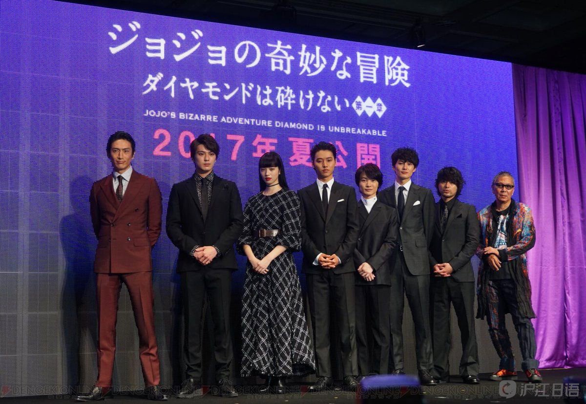 東方仗助役の山崎は「自分の生きてきた時間よりも長く愛されているジョジョという作品を実写化するということで、とにかく頑張るしかないなと思っているんですけれども、これから映像になっていくということにわくわくしています。不安もたくさんありますが、楽しみにしております」と意気込み。この日は山崎のほかの出演陣も登壇。空条承太郎役に伊勢谷友介、広瀬康一役に神木隆之介、虹村億泰役に真剣佑、虹村形兆役に岡田将生、山岸由花子役に小松菜奈、片桐安十郎役に山田孝之が決定したことが公表された。また登壇はなかったものの、東方朋子役に観月ありさ、東方良平役に國村隼になったことも明かされた。